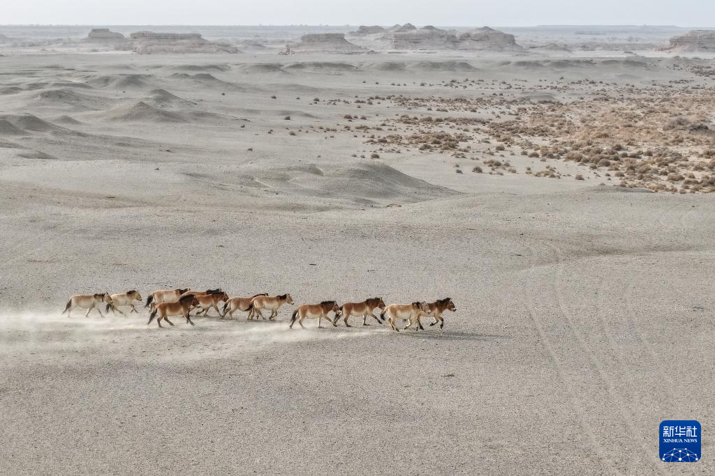 一群普氏野马在甘肃敦煌西湖国家级自然保护区的戈壁荒漠上奔跑(无人机照片)。新华社记者郎兵兵 摄
